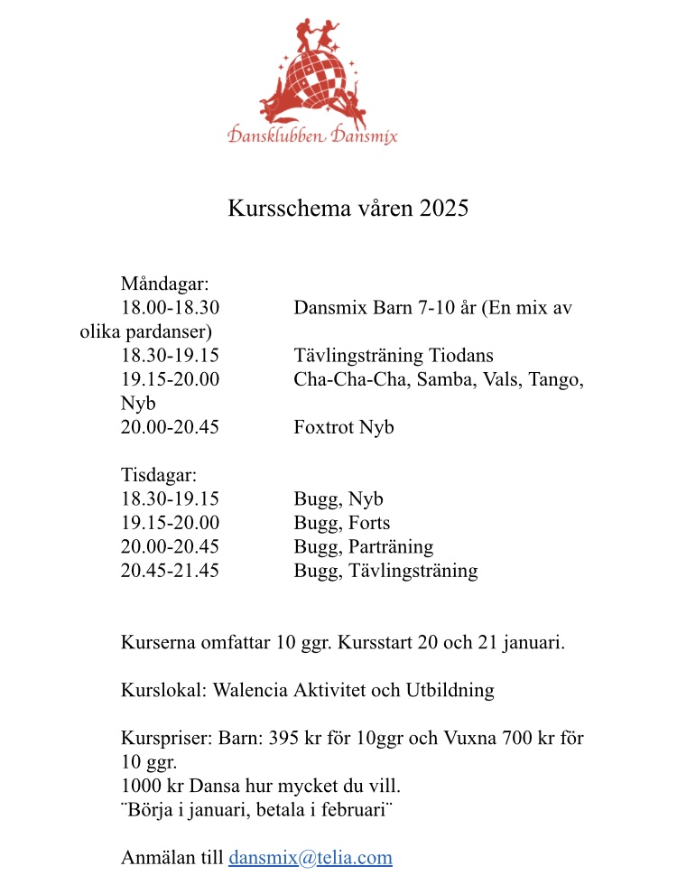 Danskurser 2025 av Sven Hämberg | 2024-12-01 | Danskurs I samarbete med Dansklubben Dansmix kan vi erbjuda vårens danskurser på fina Walencia Aktivitet och Utbildning. Välkomna att var med i vår fina gemenskap.